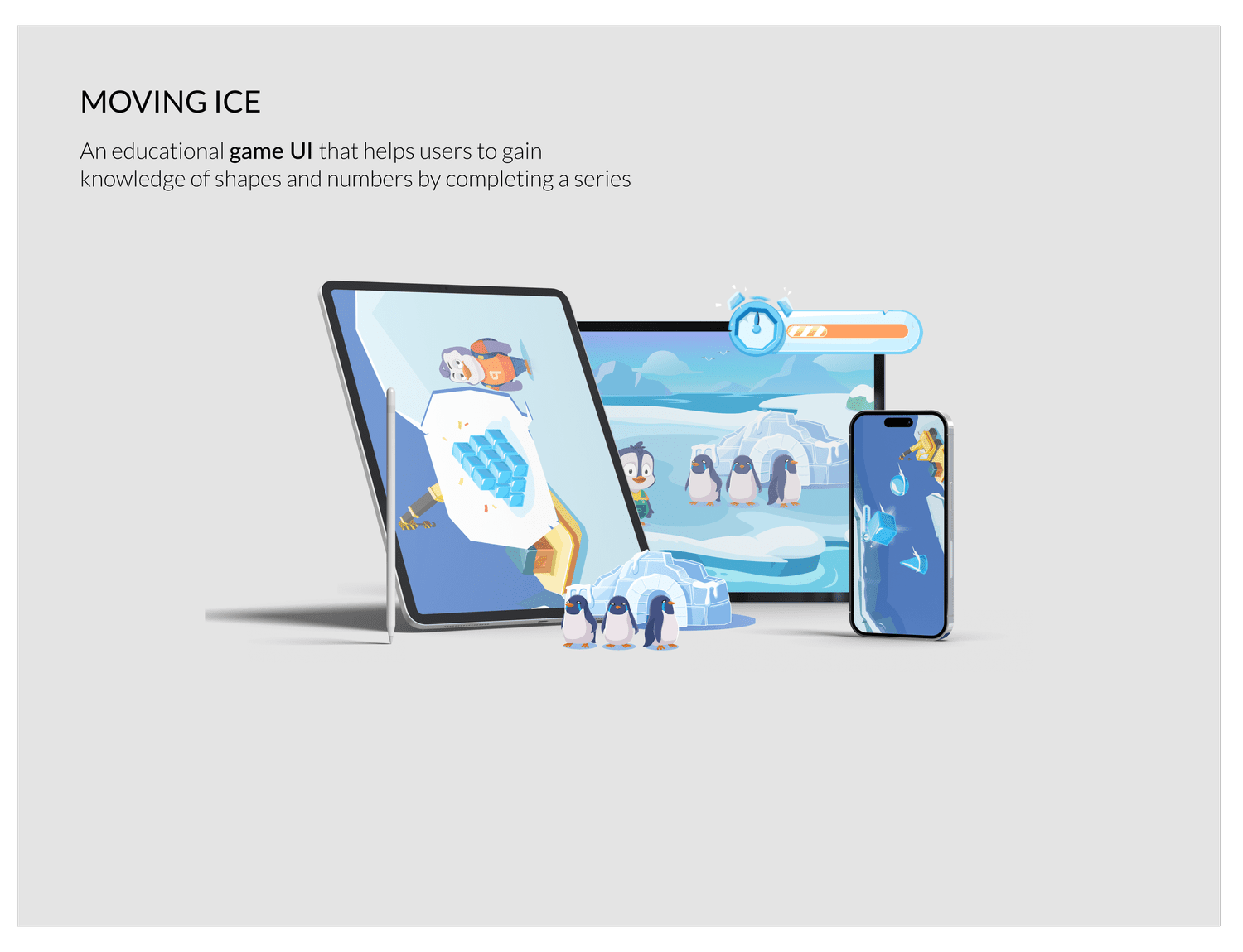 I designed "Moving Ice," a geometry puzzle activity for kindergarten to 1st grade as part of this approach. Students help little penguins construct a house by identifying and placing shapes, improving their knowledge of conditions and numbers throughout the series.